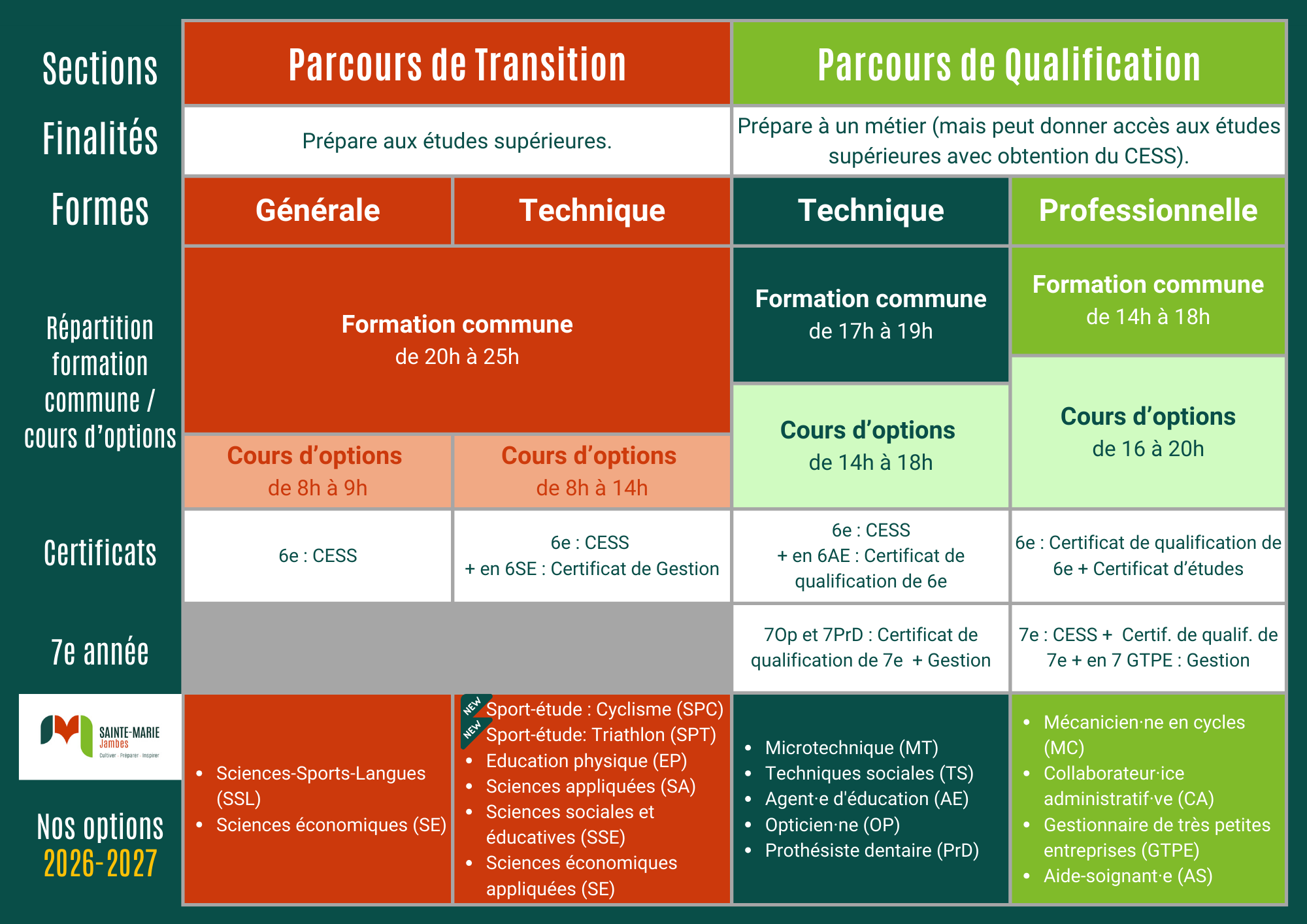Le tableau ci-dessous vous présente nos 4 formes d'enseignement (Générale, Technique de Transition, Technique de Qualification et Professionnelle) ainsi que les certifications associées.